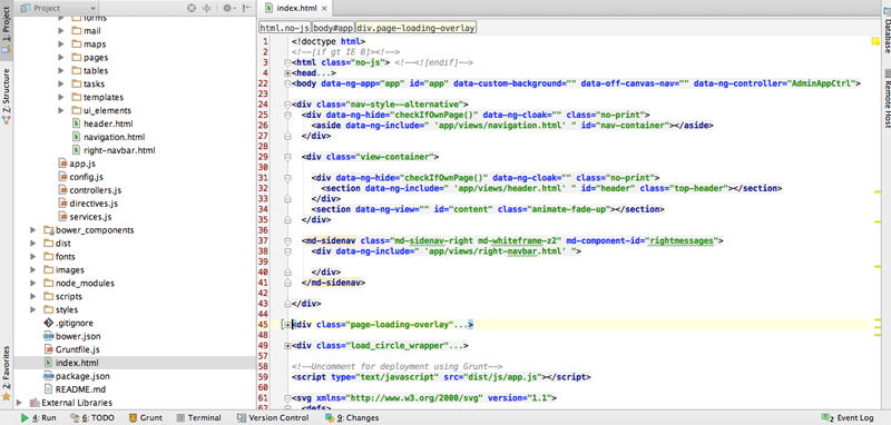 Contians all the main includes, the overall sctructure of the page. Here is where lies the main imports for javscript and css, font, and HTML dom representation. Templates of specific pages are not present here but imported using ng-include